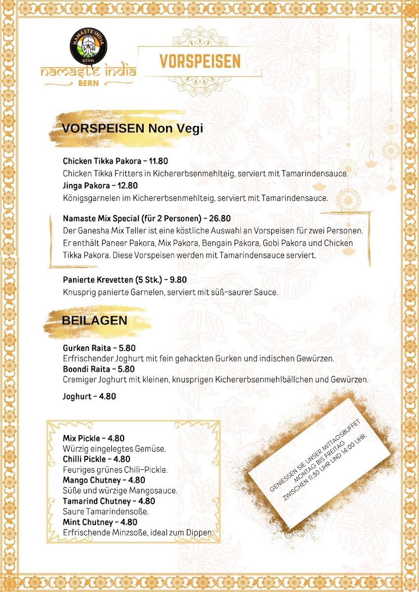 Welcome to Namaste India - Indian Restaurant, an exquisite culinary haven located at Monbijoustrasse 26, Bern. Here, Indian flavors come alive through a diverse menu that tantalizes your taste buds.